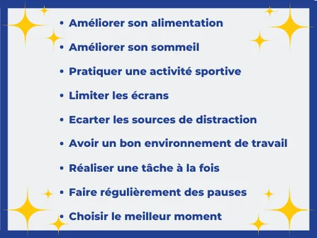 Garantir un meilleur cadre et introduire des gestes sains au quotidien sont nécessaires. Afin de préserver sa santé mentale et physique et ses performances. Voici 9 conseils pratiques afin de répondre à ces problèmes de concentration et d’apprendre à se concentrer :